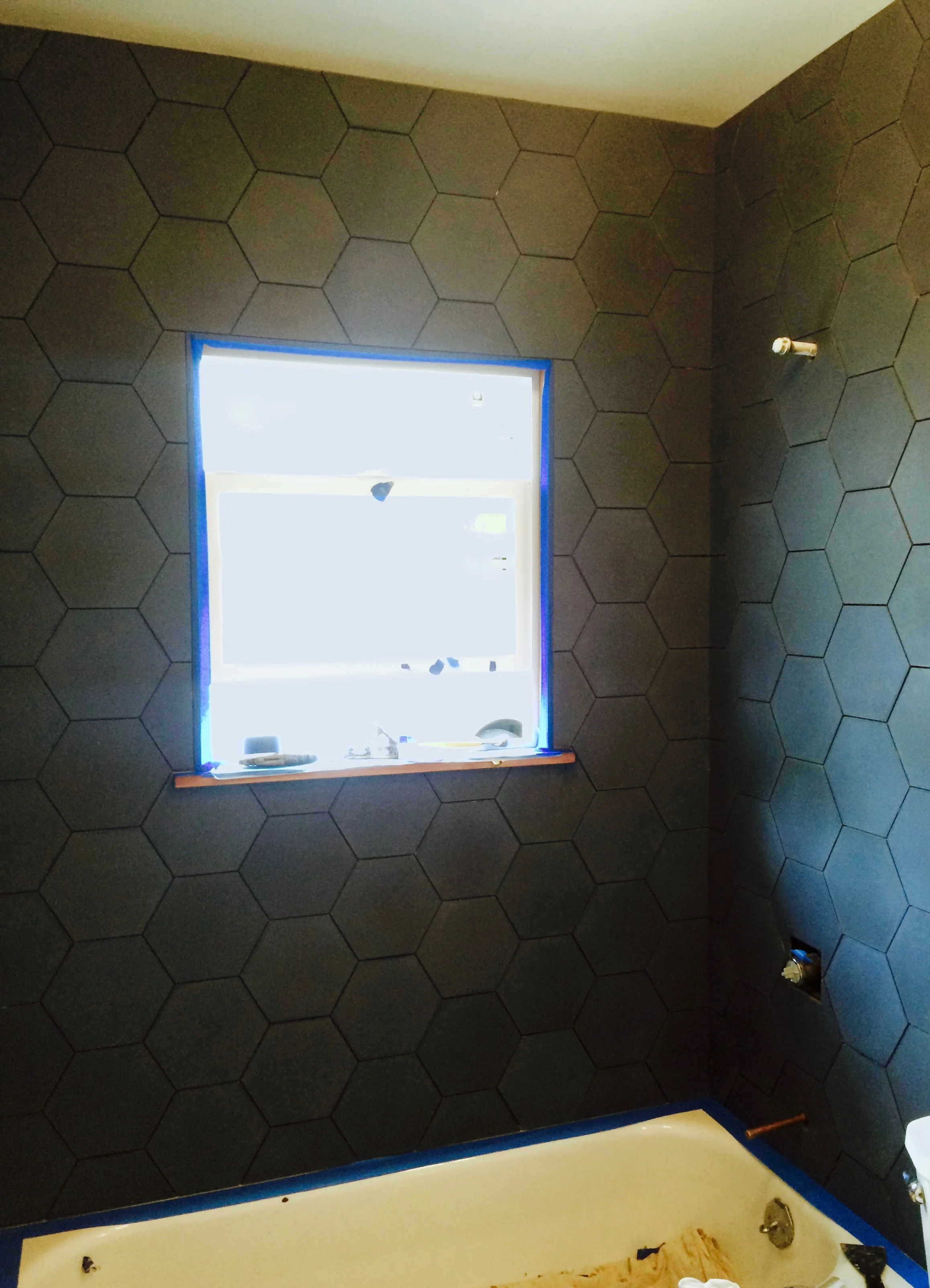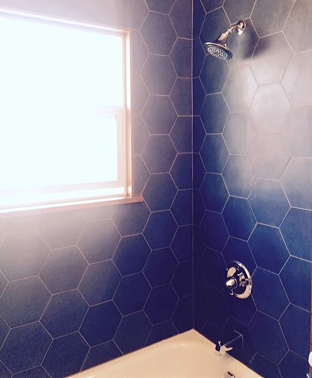 Using Cle' Tile handmade moroccan encaustic cement tile. 8" hex in their solid Himalaya color. This bathroom and it's update gave the space a whole new feel and attitude. New window and custom made cedar trim and accents by me. My client and myself couldn't be happier with the results.